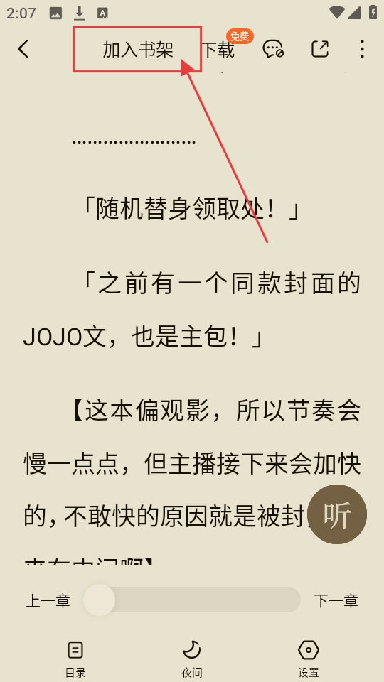 2、进入小说阅读页后,顶部有【加入书架】按钮,点击它,就能把喜欢的小说加入书架,方便后续查看哟。