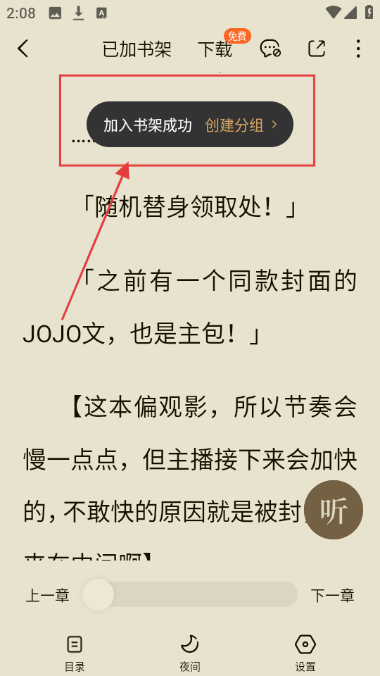 3、点击【加入书架】后,会弹出【加入书架成功】的提示,这说明小说已经成功加入书架,后续找起来就容易啦。
