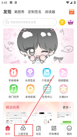 1、在首页点底部【三极字库】选项,能进入对应的字体资源页面,后续可挑选各类风格的字体啦。