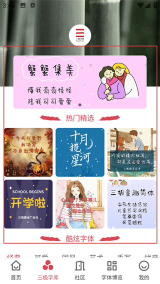2、进入三极字库页后,能看到热门精选等分类下的字体卡片,点心仪的卡片就能查看字体详情哦。