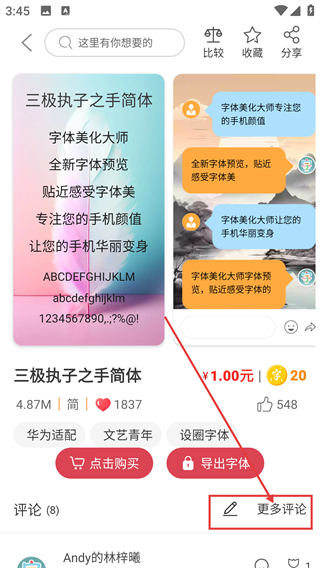 3、进入字体详情页后,点【更多评论】选项,就能查看其他用户对这款字体的评价内容啦。