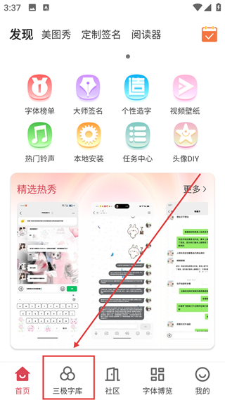 1、在APP的首页,点击底部的【三极字库】选项,可进入字体资源页面,挑选各类风格的字体啦。