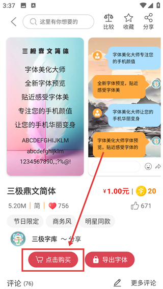 3、进入字体详情页后,确认样式无误,点击【点击购买】按钮,即可触发字体的购买流程,获取该字体啦。