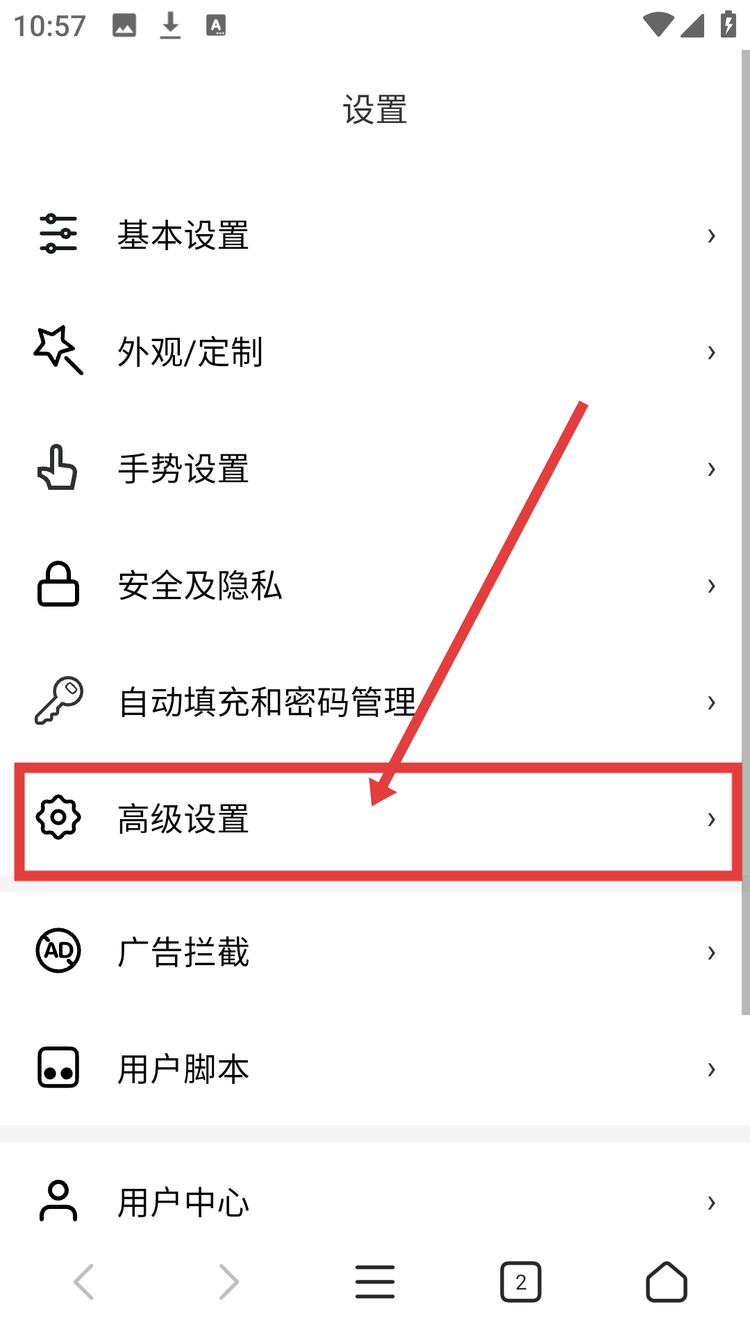 3、在设置页面点击【高级设置】,可进入高级设置页面哦。