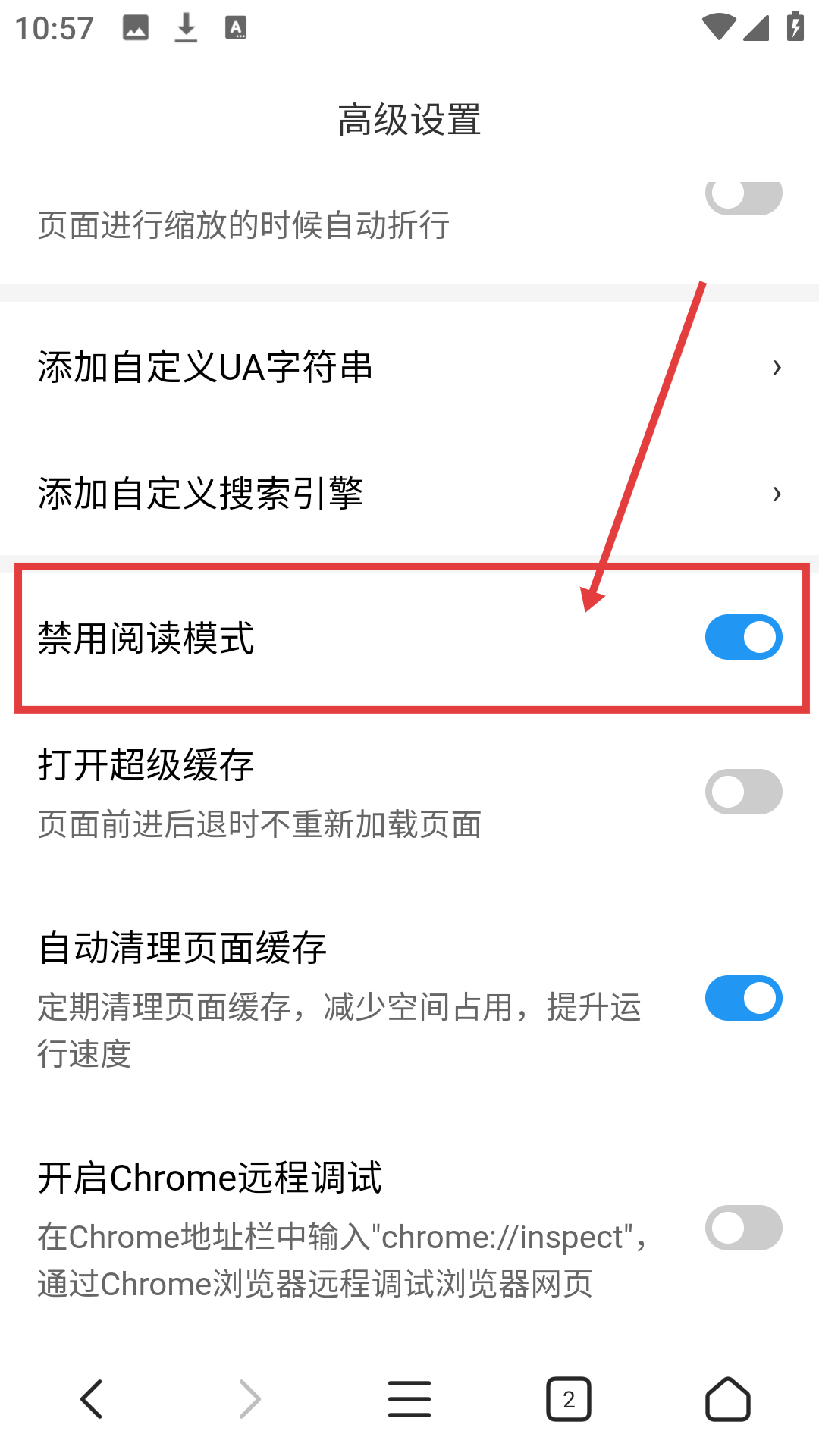 4、在高级设置页面可找到【禁用阅读模式】选项,可开启该功能啦。