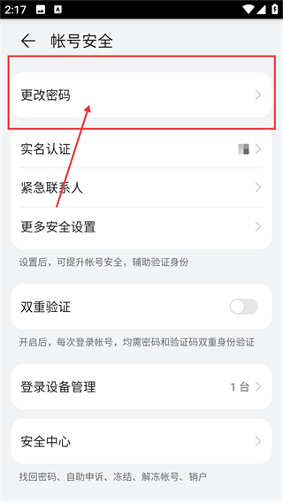3、在帐号安全页点【更改密码】选项,就能进入密码修改界面,准备更换帐号的登录密码啦。