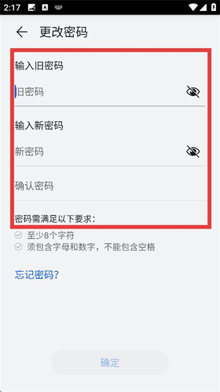 4、进入更改密码页后,按要求输入旧密码、新密码并确认,满足密码规则后就能完成修改啦。