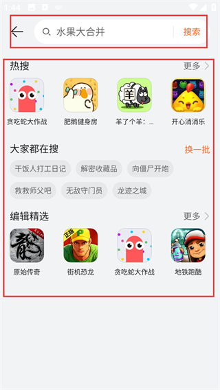 1、在搜索页能看到热搜和大家都在搜的游戏,点对应游戏图标就能进入该游戏的详情页面啦。