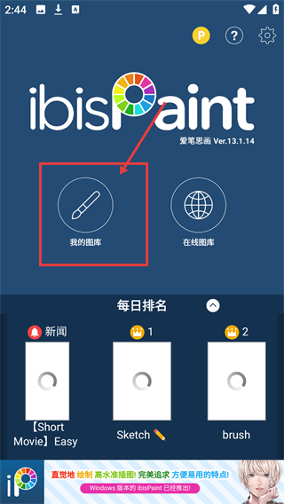1、打开【ibisPaint】APP首页,点击【我的图库】选项,进入个人作品库界面,可查看已保存的绘画作品啦。