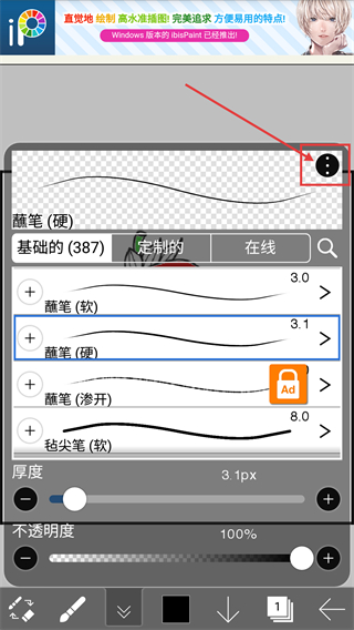 3、在笔刷设置面板中,点击右上角的三点按钮,会弹出更多笔刷操作选项,方便进行笔刷的导入导出等操作呀。