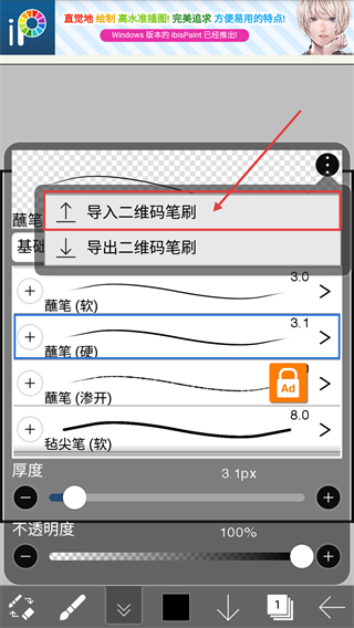 4、在弹出的操作选项里,选择【导入二维码笔刷】,即可通过二维码导入新的笔刷资源,丰富绘画工具啦。