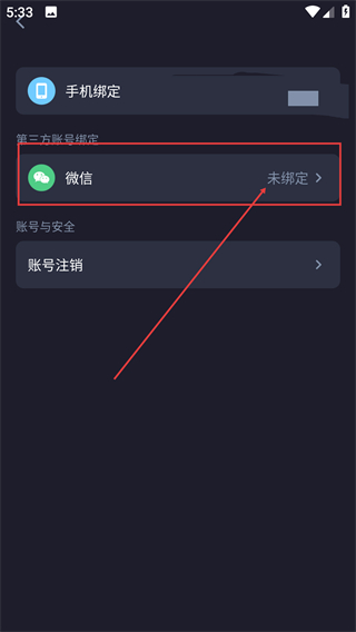 4、在【账号与绑定】页面,点击【微信】-【未绑定】,可进行微信绑定操作。