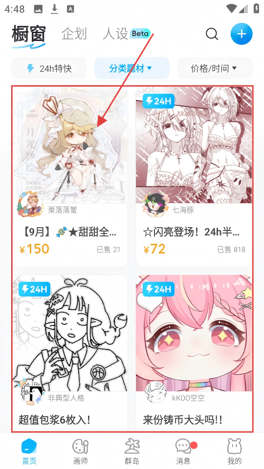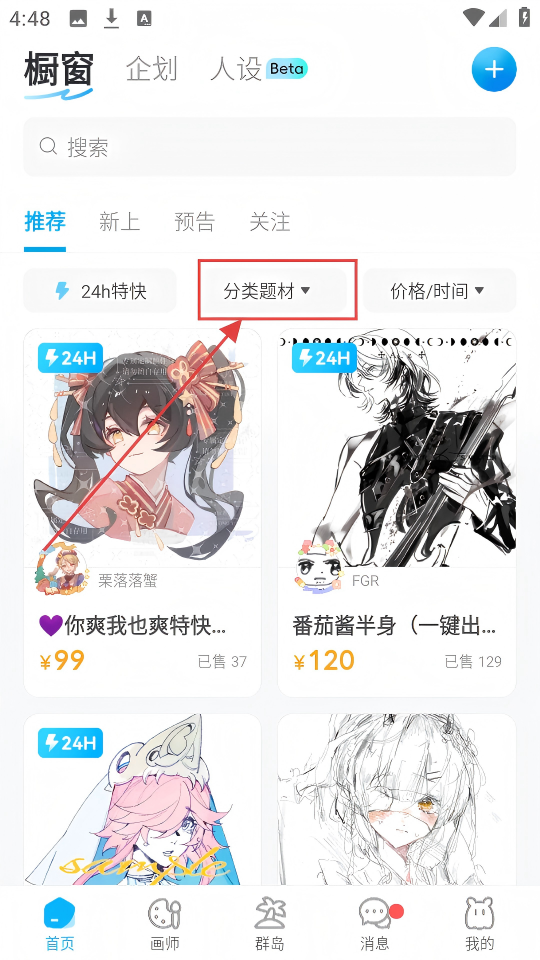 1、进入米画师的【橱窗】页面,点击【分类题材】按钮,就能开始筛选自己心仪的作品啦。