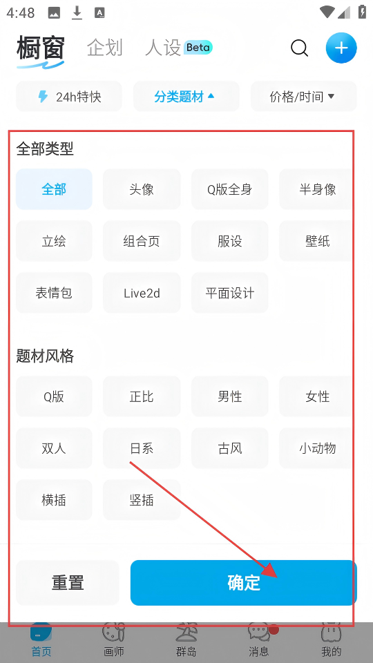 2、在弹出的筛选框里,根据需求选择作品的类型和题材风格,选好后点击【确定】。