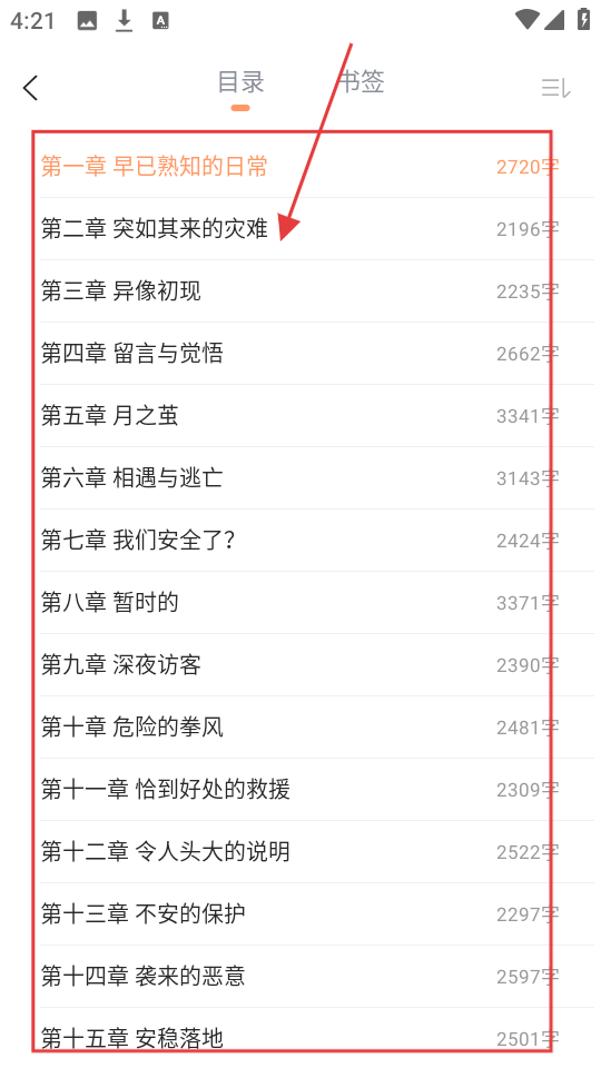 3、在目录页,有第一章、第二章等章节,选喜欢的章节点击,就能跳转阅读。
