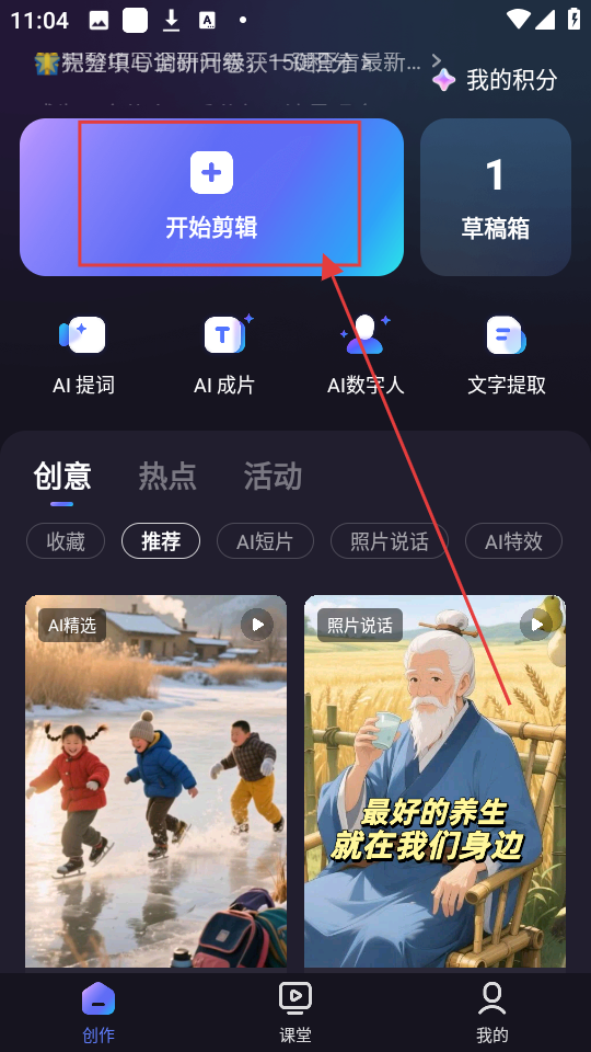 1、在创作页面,点击【开始剪辑】,可进入素材选择页面,准备选择视频素材啦。