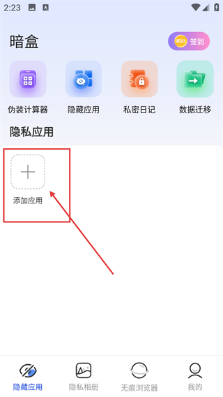 1、在暗盒的隐藏应用页面点击【添加应用】按钮,就能进入应用选择界面,挑选要隐藏的应用啦。