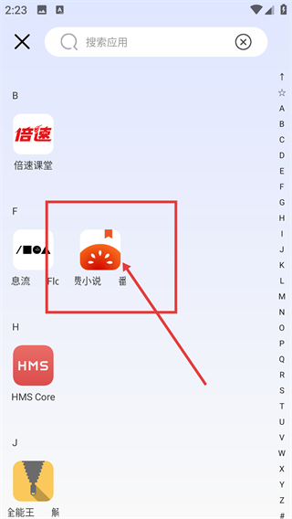 2、进入应用选择页后,可在列表里找到目标应用(比如番茄免费小说),点击它就能准备添加到隐藏空间哦。