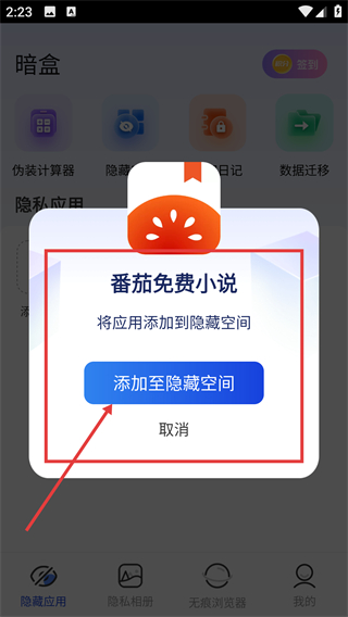 3、选中应用后会弹出确认框,点击【添加至隐藏空间】按钮,就能把该应用移入暗盒的隐私应用列表啦。