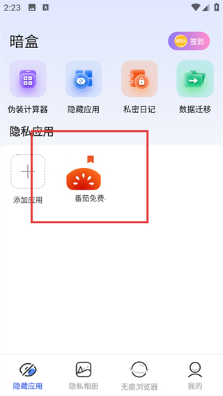 4、添加完成后,目标应用会出现在隐私应用区域,这样就能在暗盒里隐藏访问该应用啦。