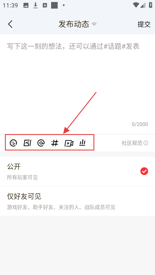 2、进入发布动态页面后,可点击下方的表情、图片等功能按钮,添加动态内容哦。