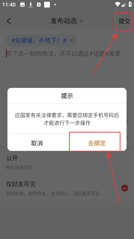 4、添加好话题和内容后,点击【提交】,若提示需绑定手机号,点击【去绑定】完成绑定后即可发布动态哦。