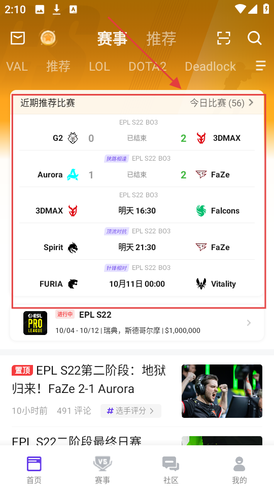 1、进入首页,能看到【近期推荐比赛】和【今日比赛-(56)】,可以先从这里了解热门赛事,选感兴趣的看看呀。