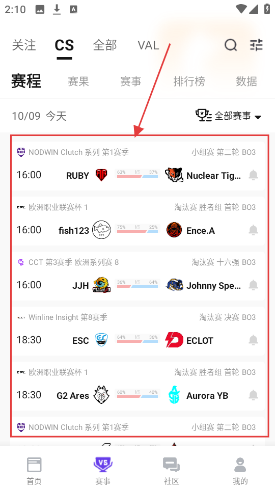 2、切换到赛事页面,在【赛程】里能看到当天各场比赛安排,像不同战队的对决时间,方便提前规划观看。