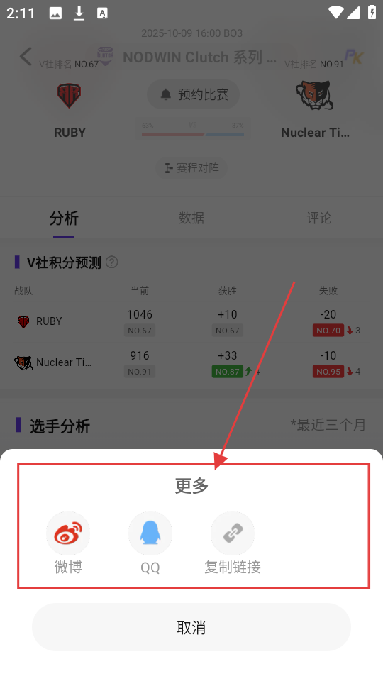 4、要是想分享比赛,点击【分享】后,会弹出【更多】选项,能选【微博】【QQ】或者【复制链接】,超方便的。