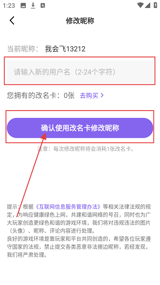 4、进入修改昵称页面,输入新的昵称后,若有改名卡,点击【确认使用改名卡修改昵称】,就能完成昵称修改啦。