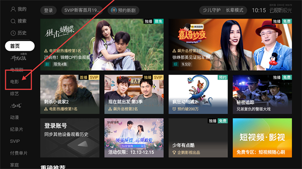 1、在首页左侧栏点【电影】选项,就能切换到电影专区,浏览各类电影资源,找想看的影片啦。