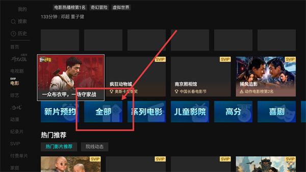 2、进入电影专区后点【全部】按钮,能展开分类筛选栏,可按类型、地区等条件精准找电影哦。