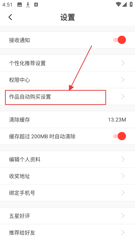 3、在设置界面里,找到【作品自动购买设置】选项,点击它可以设置作品自动购买相关内容。