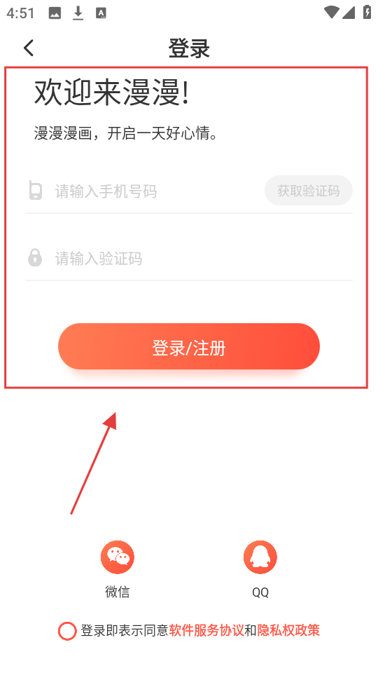 4、要是需要登录,在登录页面输入手机号码,获取并输入验证码,点击【登录/注册】按钮就能登录啦。