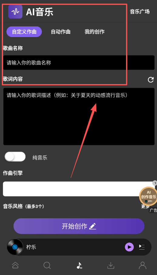 2、接着填写歌曲信息,在歌曲名称栏输入你想要的歌名,在歌词内容区简单描述主题,记得在纯音乐选项里勾选作曲引擎。