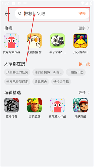 2、进入搜索页后,在搜索框输入关键词,还能看热搜或大家都在搜的内容,快速找心仪游戏哦。