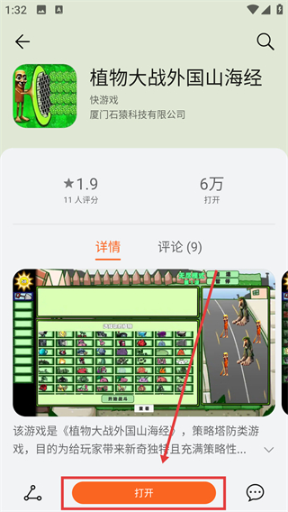 4、进入游戏详情页后,确认是想玩的游戏,点底部【打开】按钮就能启动游戏开始游玩啦。