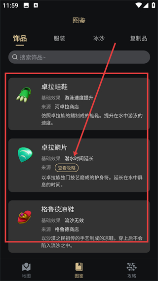 1、在地图页面点击底部的【图鉴】选项,就能切换到图鉴界面,查看各类道具和装备的信息啦。