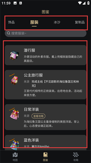 4、在图鉴切换到【服装】分类,能查看各类服装的来源,比如【公主旅行服】需完成主线任务获取。