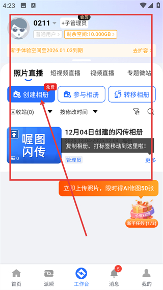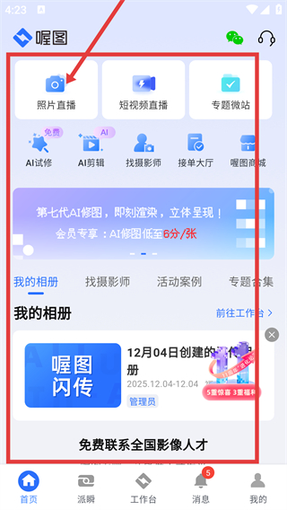 1、在首页点【照片直播】选项,能进入照片直播的功能界面,后续可创建或管理直播相册啦。