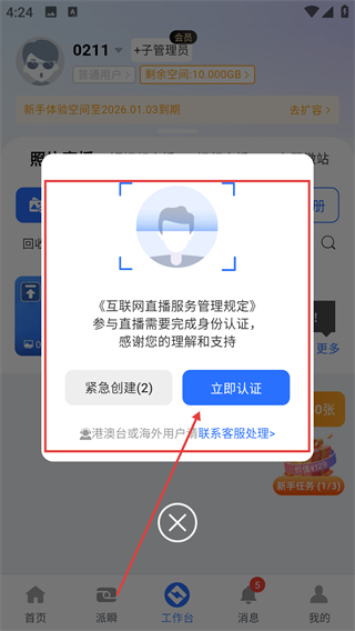 3、创建相册时会弹出身份认证提示,点【立即认证】完成认证,就能正常使用直播相册功能啦。