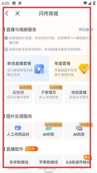 4、还可以切换到闪传商城,能看到【单场直播套餐】【AI修图】等服务,可按需选购来拓展功能哦。