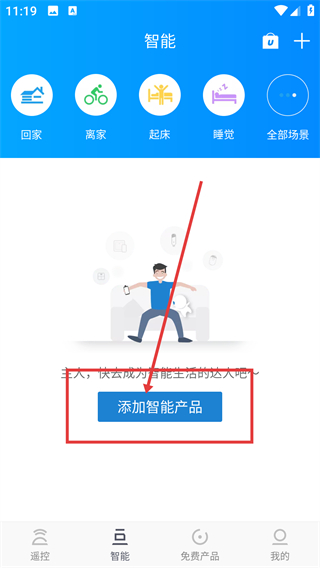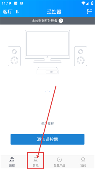 1、在遥控器页面点底部的【智能】选项,能切换到智能场景页面,后续可添加智能产品配置场景啦。