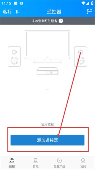 1、在遥控器页面点击【添加遥控器】按钮,就能进入设备添加界面,开始配置红外遥控设备啦。