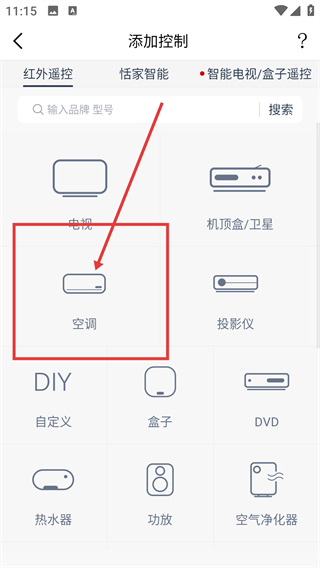 2、进入添加控制页面后选择【空调】选项,就能进入空调的品牌选择界面,准备匹配对应的设备哦。