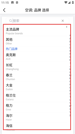 3、在空调品牌选择页,可从【主流品牌】【热门品牌】里选对应品牌,快速匹配空调的遥控参数啦。