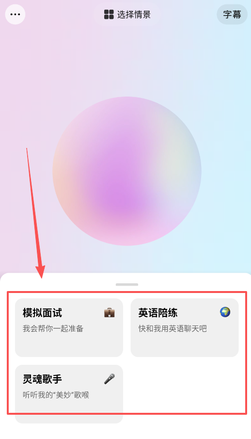 4、情景选择在功能列表,模拟面试帮你准备求职问答,英语陪练创造对话环境,灵魂歌手提供娱乐互动。
