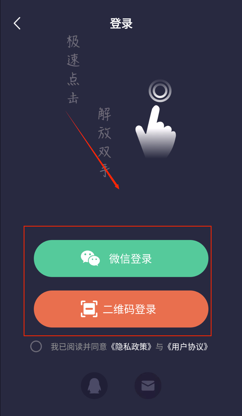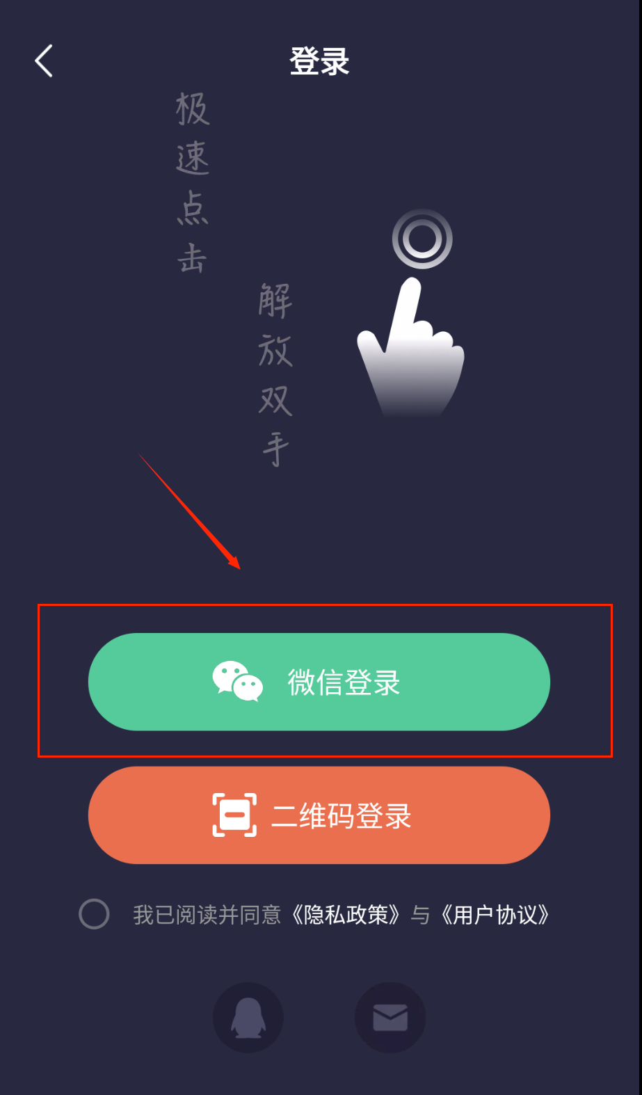 1、打开软件后首先来到登录界面,顶部中央显示"登录"字样,左侧有返回箭头可用于返回上级页面,右侧有"极速点击解放双手"的功能提示。
