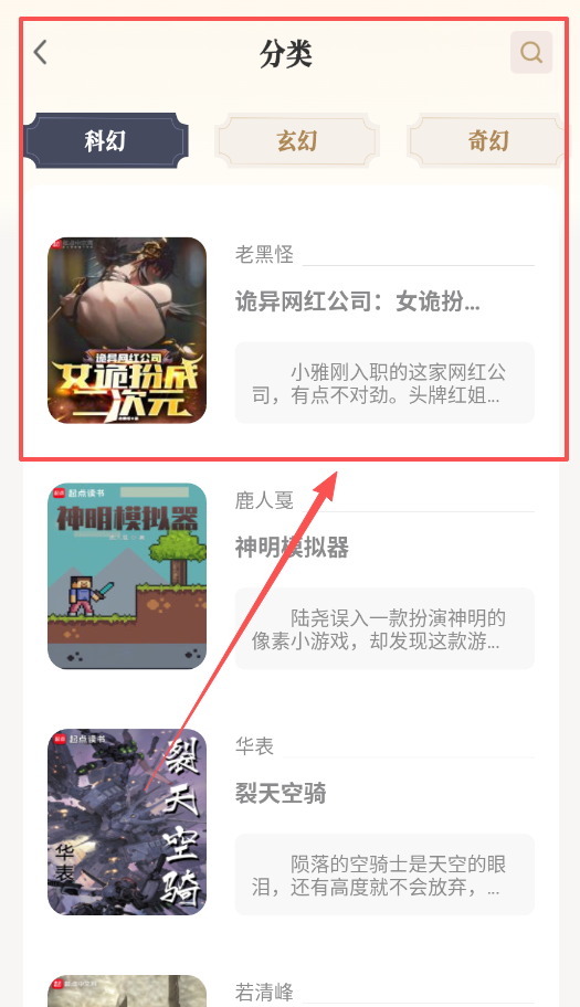 2、在首页点击顶部分类按钮,会展开更详细的图书分类列表,包括科幻、玄幻等细分标签。