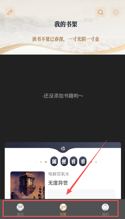3、书架功能位于底部导航栏中间位置,新用户首次进入会看到“还没添加书籍”的提示。